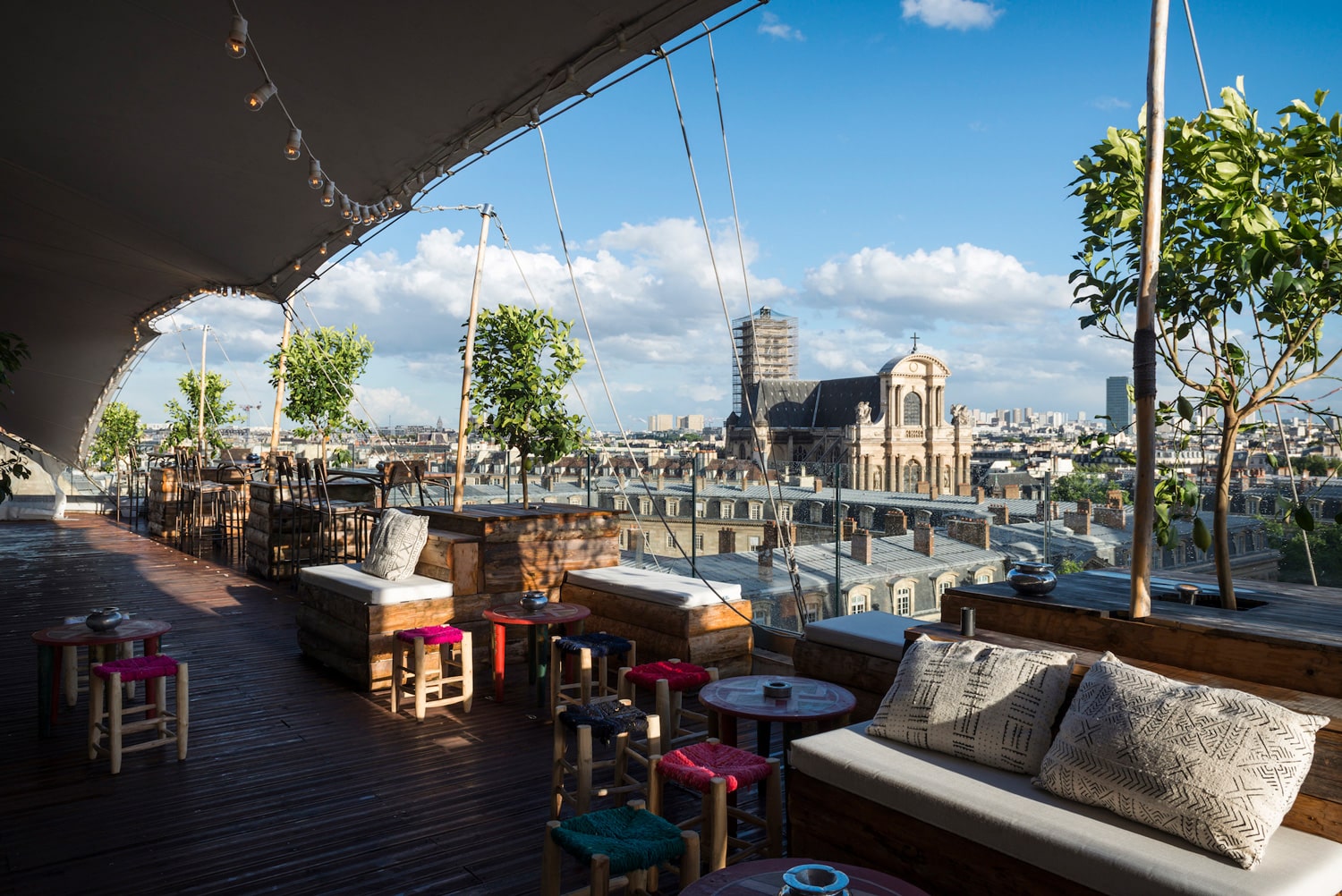 Niché au 6ème étage du BHV, Le Perchoir Marais rooftop nous plonge dans une ambiance cosy et festive. La décoration reste fidèle à son aîné Le Perchoir : canapés et tables en bois fait à partir de récup’, le tout agrémenté de palmiers. La musique y est entraînante, mêlant DJ sets et sessions live, au gré des envies de l’équipe. À la carte du Perchoir Marais, on retrouve des cocktails originaux spécialement concoctés par le chef, mais aussi des bouteilles de vin blanc, rosé et rouge de très bonne qualité. Et pour les petits creux en milieux de soirée, vous pourrez déguster des assiettes de fromages et charcuteries ! Une fois que vous aurez essayé le Perchoir du Marais, n’hésitez pas à tester les autres rooftops de la fratrie : Le Perchoir de l’Est et Le Perchoir Porte de Versailles !